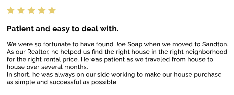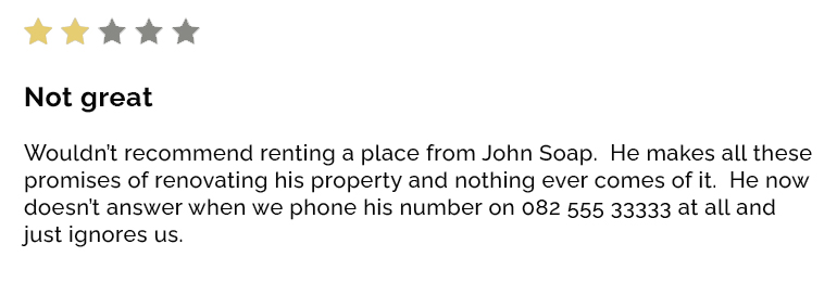 Reviews on Property Wars shouldn’t contain information that identifies people — such as names, phone numbers, or addresses. We also don’t allow reviewers to use their review to promote other companies. For example, the author of this review could be asked to edit it: